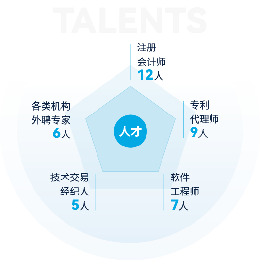 截止2024年,公司擁有各類人才400余人,其中全職博士2人,全職碩士23人,本科188人,專科200余人,注冊會計師12人,專利代理師9人,軟件工程師7人,技術交易經(jīng)紀人5人,南京企服中心等各類機構外聘專家6人,公司還和南京大學、東南大學、南京農(nóng)業(yè)大學、南京信息工程大學、南通大學、江蘇開放大學等建立了良好的合作關系。